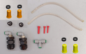 (2x nozzle holder; 2x pipes 6mm x 15cm; 2x pneumatic locker 4mm; 1x pneumatic locker 6mm; 2x nozzle cone yellow+gasket; 2x nozzle cone orange+gasket; 2x antidrop valve; t-connection 6mm) |