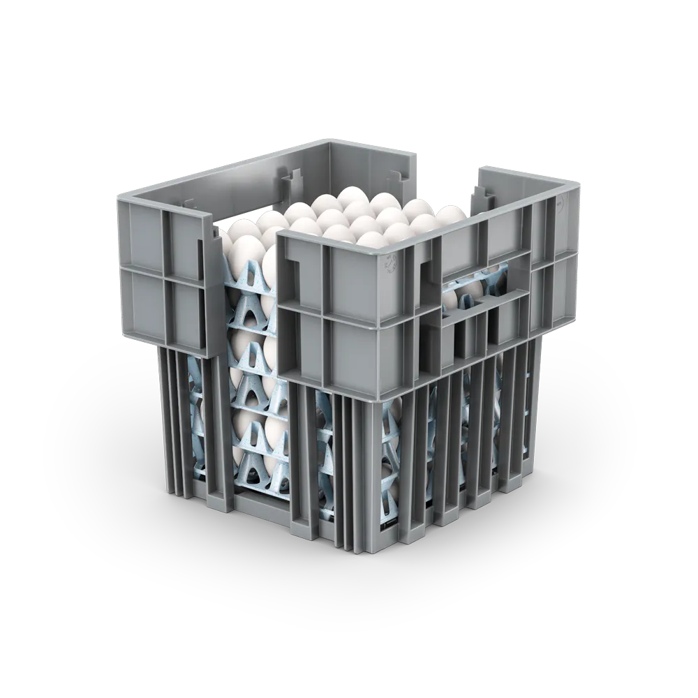 Ці ящики можна повністю штабелювати та вставляти. Насправді, ящики з яйцями можна легко складати для транспортування, при цьому яйця в лотках не пошкоджуються. Зворотне транспортування також стає зручним завдяки цій вставній конструкції.